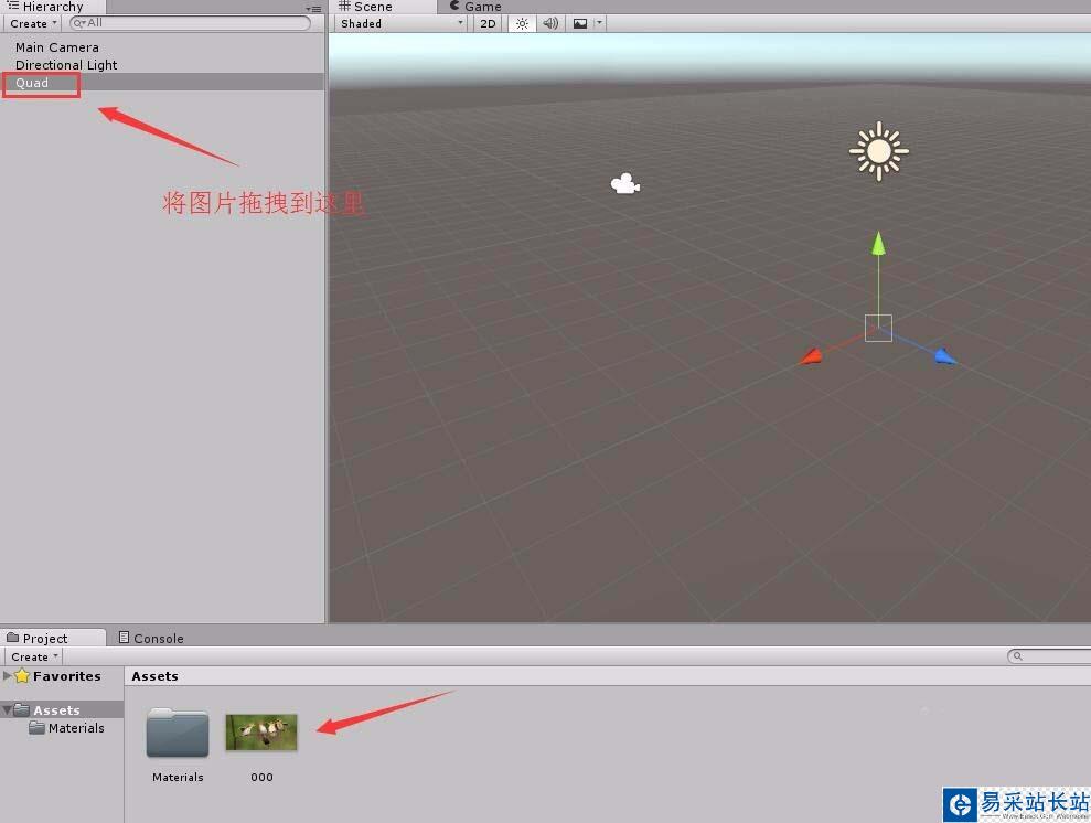 6、在assets里找到我們的圖片,用鼠標左鍵將該圖片拖拽到hierarchy里創建的quad上,就將材質添加上了,如圖所示:
