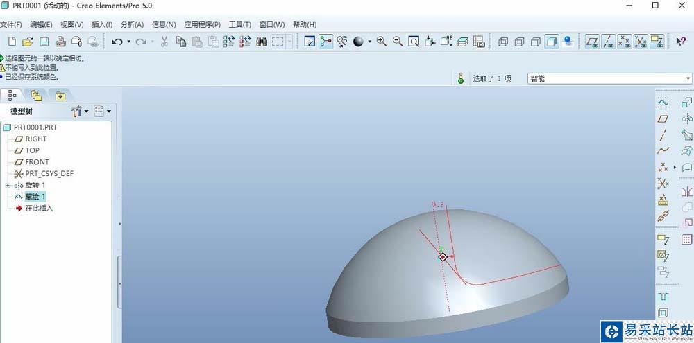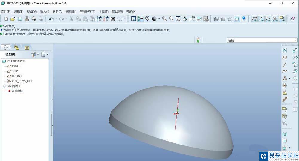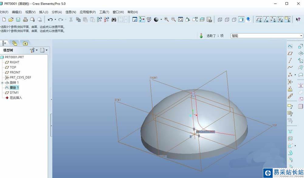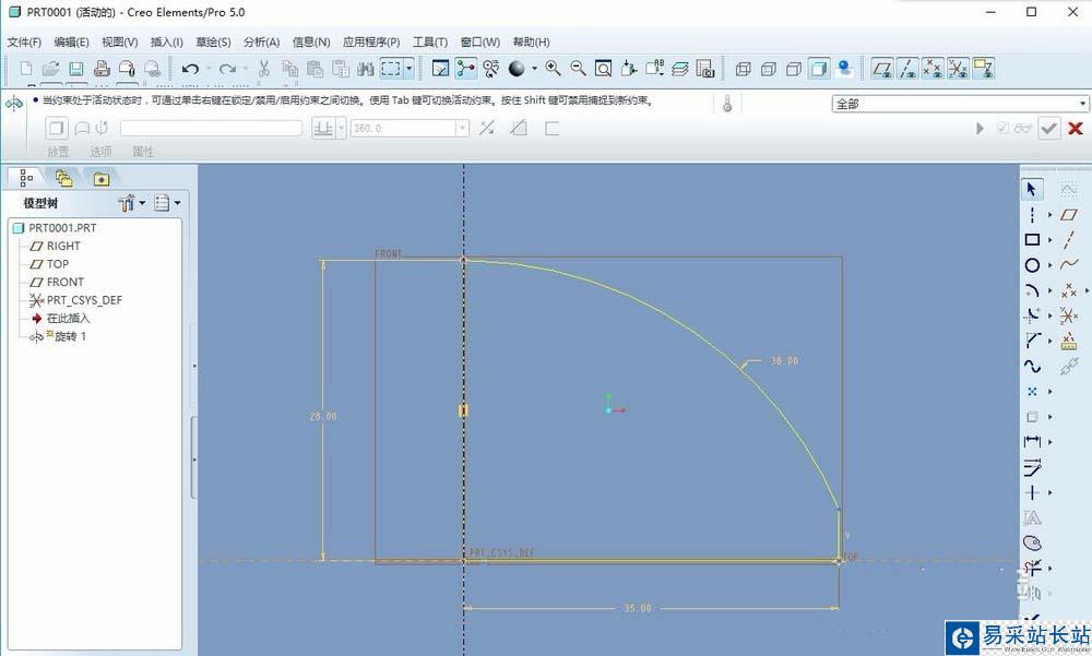 2、點擊旋轉特征圖標,以front平面為草圖平面,利用直線、中心線、圓弧繪制圖形,完成后退出草圖,定義旋轉類型與角度回車或者中間確定。