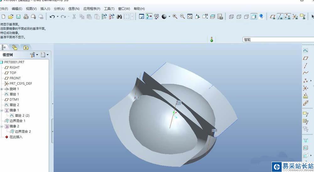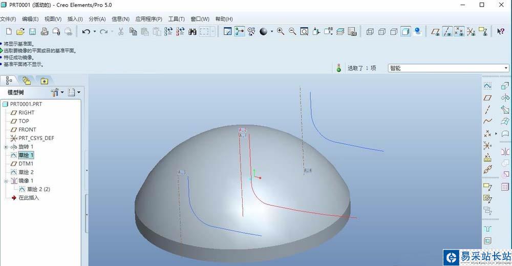5、鏡像,將上述一步所繪制的曲線作為鏡像特征,定義front平面為鏡像平面,效果如下圖所示。