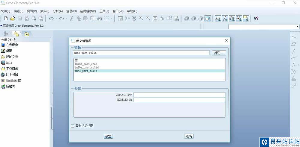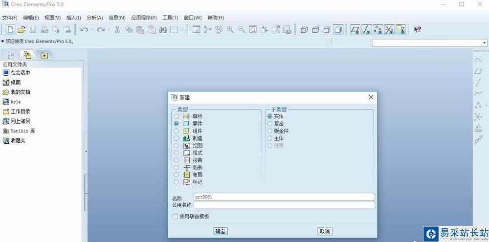 1、雙擊打開proe5.0軟件,點擊新建圖標,選擇類型為零件、子類型為實體,取消使用缺省模板的打勾,再選擇mmns_part_solid,即毫米單位。