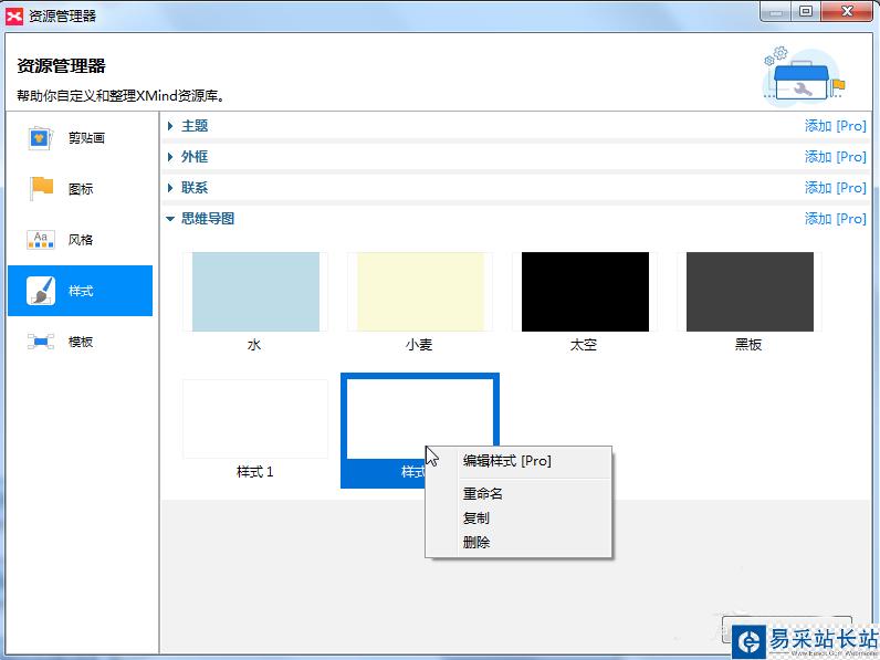 2)XMind 8對(duì)樣式進(jìn)行了分類匯總,包含主題、外框、聯(lián)系、思維導(dǎo)圖。單擊“添加”,可自動(dòng)義添加所需樣式。