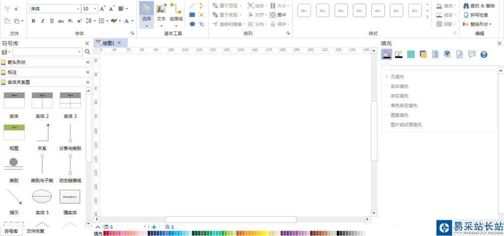 2、創(chuàng)建空白畫布后,可以查看到箭頭形狀、標(biāo)注和實(shí)體關(guān)系圖,如下圖所示: