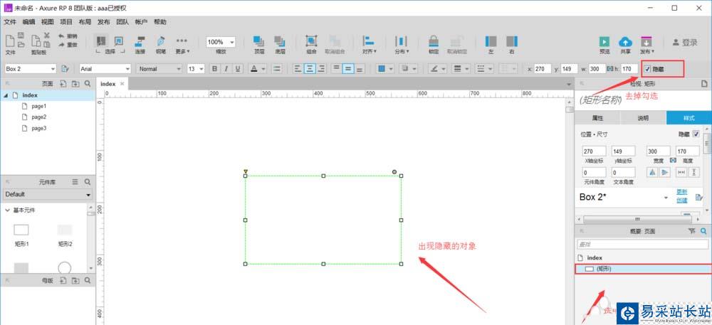 6、順便教大家如何將隱藏的元件再顯示出來,在下圖中右側的概要:頁面中點擊我們隱藏掉的元件,在畫布中將出現隱藏的元件,然后去掉右上角“隱藏”的勾選。