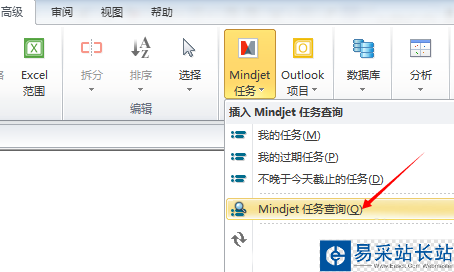 2、在功能區(qū)的任務(wù)選項(xiàng)卡或高級(jí)選項(xiàng)卡上,點(diǎn)擊Mindjet任務(wù),在下拉菜單中點(diǎn)擊預(yù)先定義的查詢或點(diǎn)擊Mindjet任務(wù)查詢;