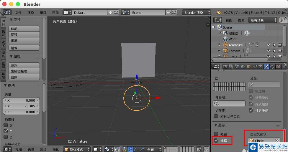 5、在里面找到“自定義形狀”選擇“Circle(圓環(huán))”,勾選“線框”,我們發(fā)現(xiàn)骨骼就變成圓環(huán)的形狀了。