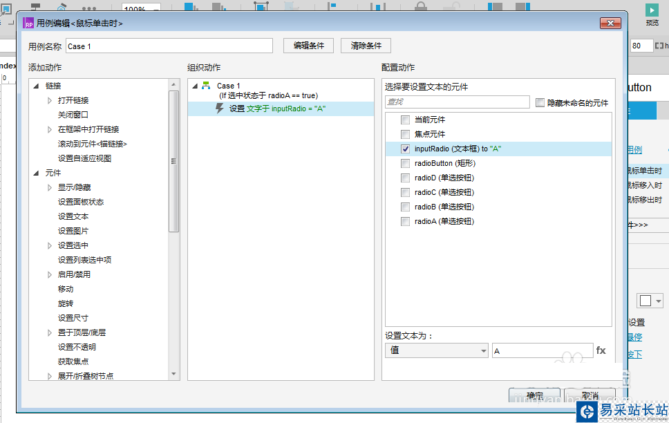 6、選擇按鈕點擊“鼠標單擊時”,設置選擇單選按鈕時,輸入框顯示的內容,如下圖所示: