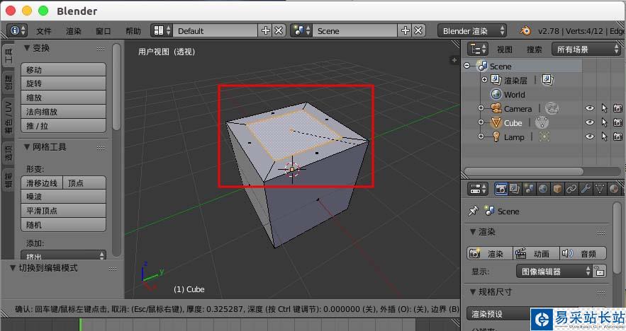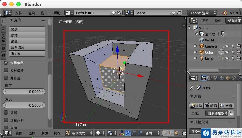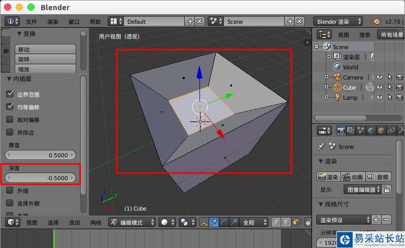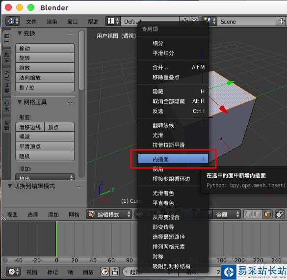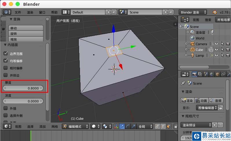 8、其實我么插入面,也可以使用e擠出,然后s進行縮放,但是這種“i”直接插入的好處就是可以靈活設置深度、厚度等數值就可以得到自己需要的面。像如果我們選擇兩個相鄰的面,通過“i”插入后,可以任意設置厚度數值,深度為0這樣就固定了深度。