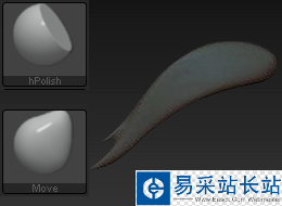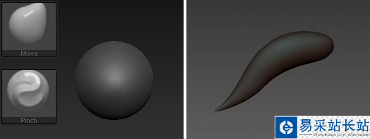 1、在Tool工具面板上,插入球體并在工作區拖拽鼠標繪制,單擊“Edit”進入編輯模式,單擊“Make PolyMesh3D”按鈕,為了方便觀察,您可以更換材質。使用“Move [移動]”筆刷來獲得所需的形狀,切換至“Pinch [捏擠]”筆刷,收縮模型的表面,將邊緣逐漸捏尖,如下圖所示。