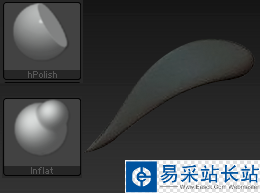 2、使用“hpolish”筆刷來刷出兩側和根部的頭發部分,為了體現頭發質感有軟硬變化,就用這個筆刷塑造一些稍微硬、平整一點的效果。使用“Inflat”筆刷讓頭發從根部開始飽滿起來,并確保它逐漸變薄。