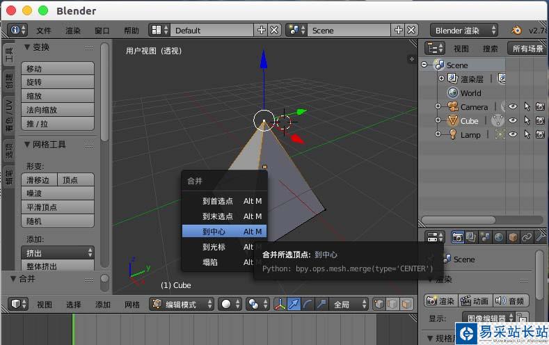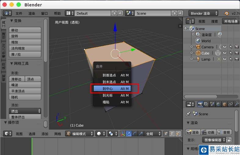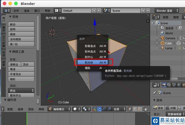 7、然后alt+m選擇“到光標”,我們發現選中的頂點都合并到光標的位置了。