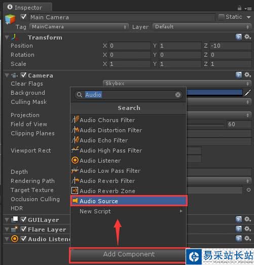 2、點擊“Add Component”按鈕后,在搜索框中輸入“Audio”關鍵字,在出現的下拉框中選中“Audio Source”選項,如下圖所示。