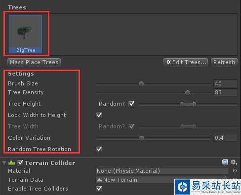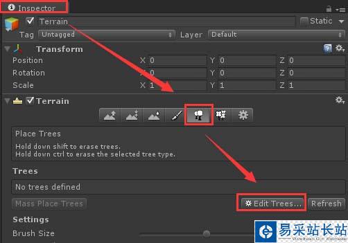 8、完成樹木的選擇后,可以看到Inspector視圖中的Trees一欄中對應選擇的樹類型,通過更改Settings選項來設置繪制樹時畫筆的大小(Brush Size)、樹的密度(Tree Density),樹的高度(Tree Height)等等。
