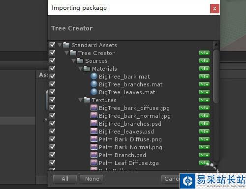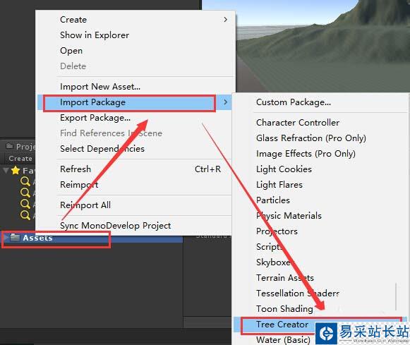 2、導入樹木資源,確保你已經導入了樹木資源,如果沒有需要導入一下,導入系統自帶的樹木資源包步驟如下:光標放到Project視圖中或直接右擊Assets文件夾,在彈出來的列表中點擊“Import Package”-->“Tree Creator”,如下圖所示。