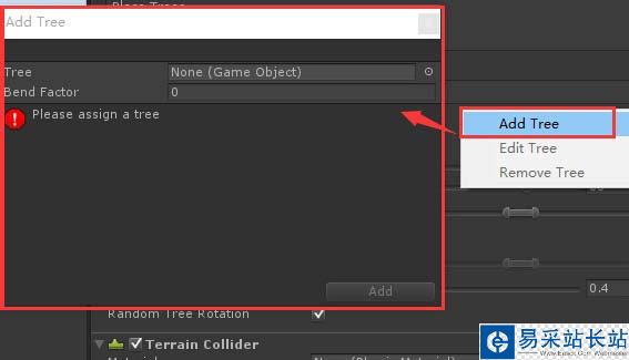 5、樹木資源包導入完成后,在Hierarchy視圖選中“Terrain(地形)”,點擊Inspector視圖中樹木圖標,然后點擊“Edit Trees”按鈕,如下圖所示。