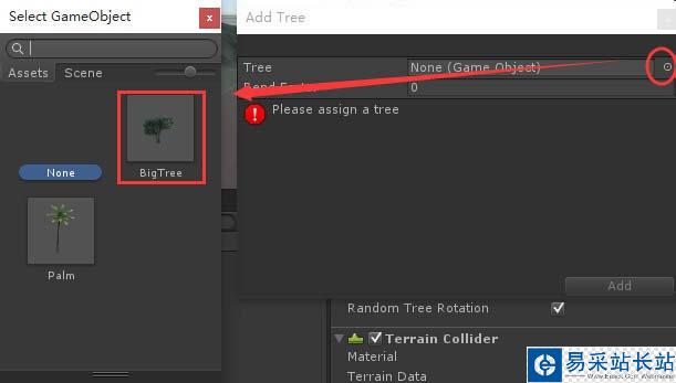 7、點擊Tree標簽對應的圓圈,會彈出一個“Select GameObject”窗口,在里面有各種樹木資源,可以自由選擇。