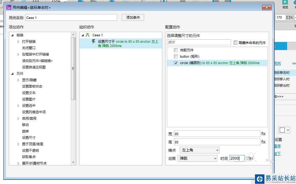4、選中“改變”按鈕,雙擊屬性“鼠標單擊時”,打開用例編輯窗口,如下圖所示: