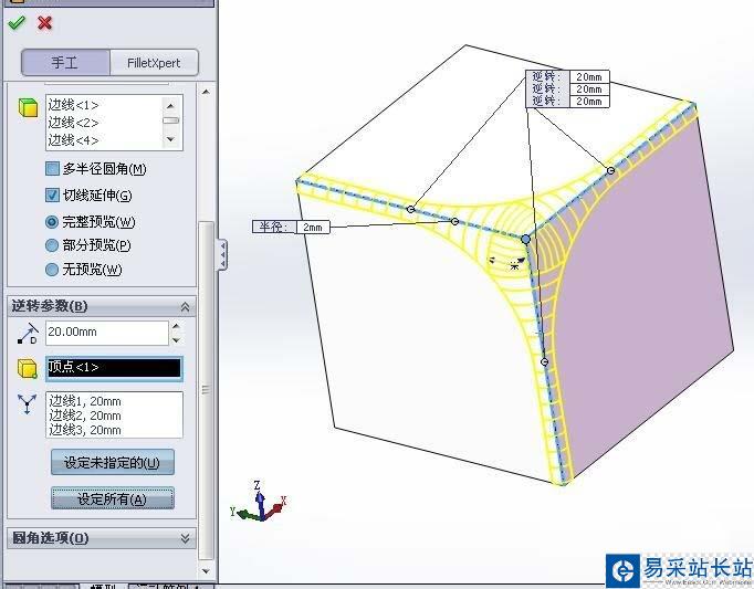5、逆轉參數設置:首先選擇三條邊相交的頂點,設置球型的半徑為20,設定為所有