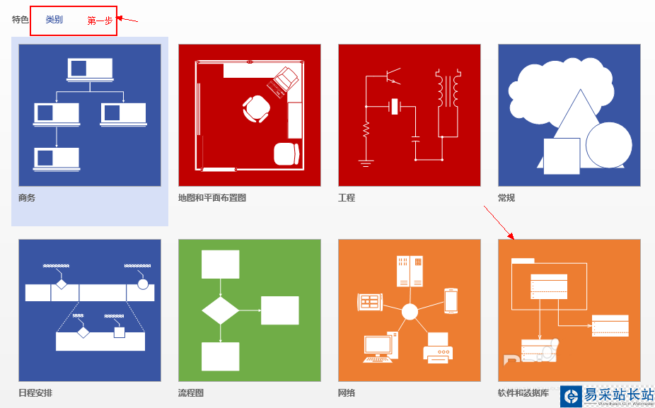 1、我們先打開Mircosoft Office VISO2013.這時會出現以下界面,我們點擊"類別",然后在點擊"軟件和數據庫".這時會調到另一個界面.