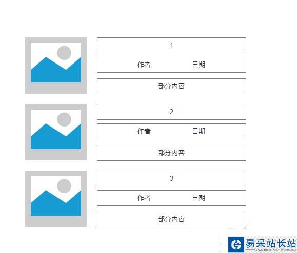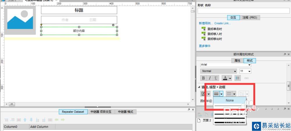 1、中繼器看似麻煩,但用多了,反而很順手:首先在頁面新建一個中繼器,雙擊后進入中繼器頁面,將原有的表格刪掉,向其中添加四個矩形一個圖片。其中第四個矩形作為分割線,調整好形狀后隱藏掉。