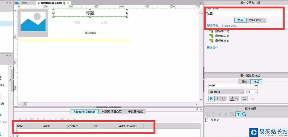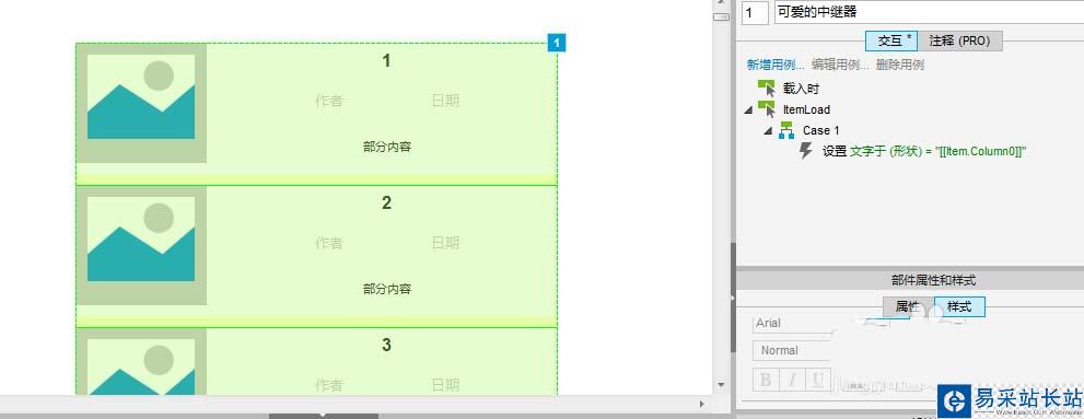 4、下面我們來看如何調整每篇文章的標題:我們在中繼器所在的頁面中選中它,可發現右側有個方法,即在加載頁面時,對其賦值:設置文字(形狀)=[[item.column0]];,我們雙擊中繼器后,在中繼器內部頁面可看到下面有個表格,其中有一列正好叫column0;其實這個方法就是將column0這一列中的所有值,按順序添加給中繼器,而中繼器能重復多少次,則是由這個表格的行數控制的。