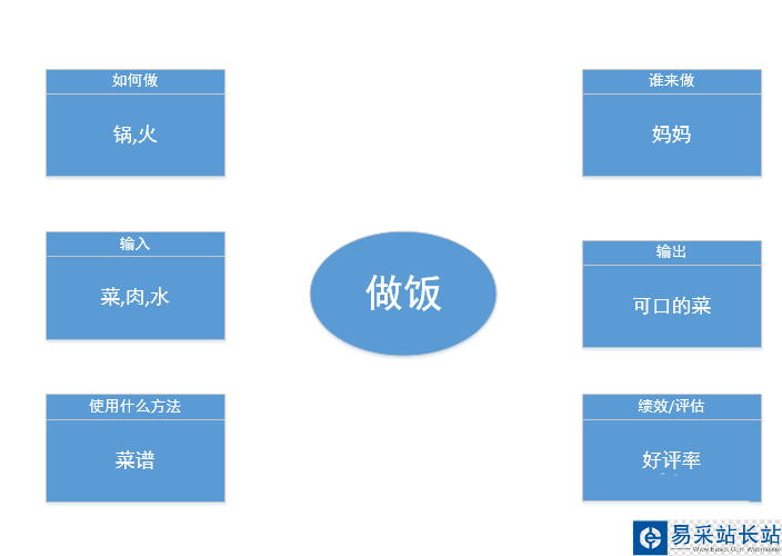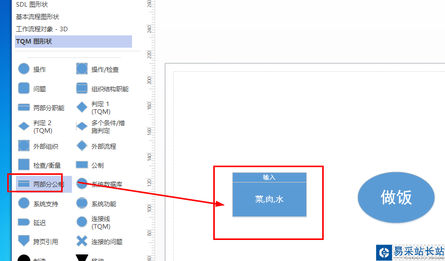 4、繼續繪制頭部,找到TQM圖中的”兩部分職能”,在上半部分填寫”輸入”下半部分輸入”菜,肉,油….”(根據實際情況填寫)