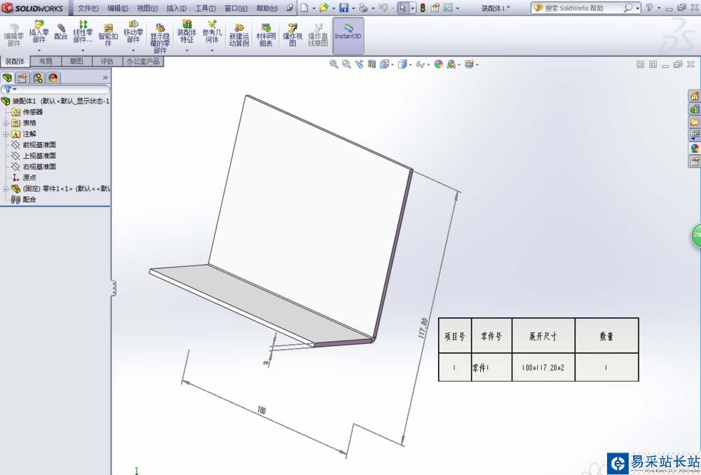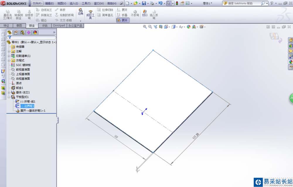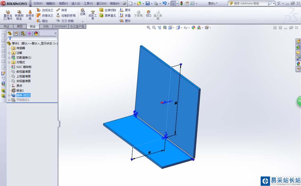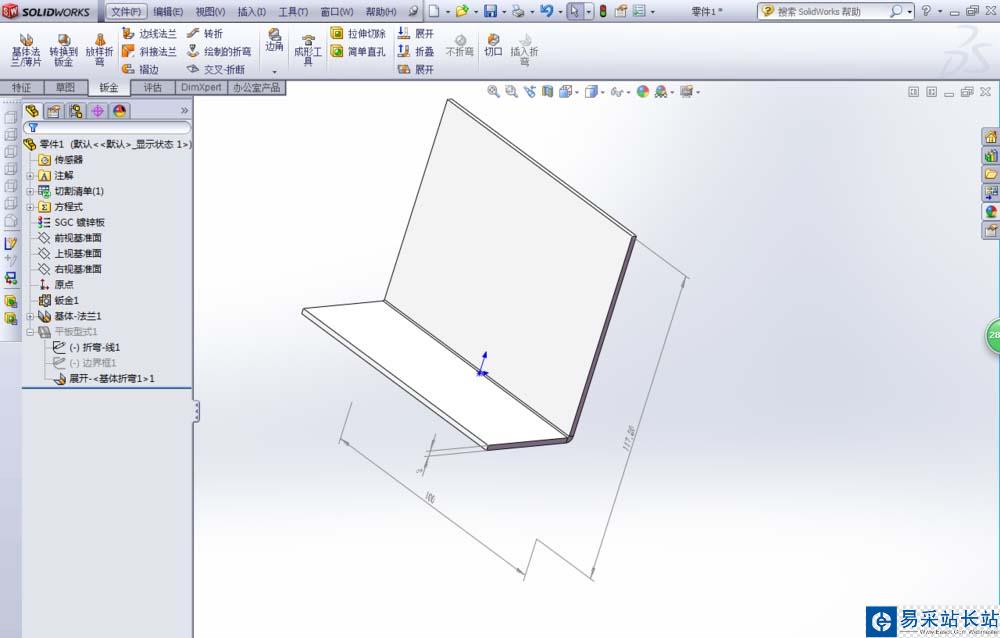 5、上面的設置好后,一定要記得將鈑金件折疊回去,否則裝配關系會混亂的。當然如果大家不喜歡窗口中的灰色尺寸標注,可以點擊視圖-所有注解將尺寸標注進行隱藏。