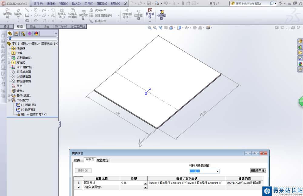 4、在子零件的文件-屬性中進行自定義編輯,如圖所示。展開的尺寸采用的是鏈接方式,直接點擊剛才標注的尺寸,中間需要使用“*”分開。展開尺寸=長度*寬度*板厚。