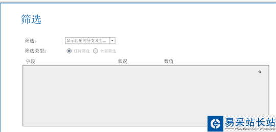 3、在該窗口中我們可以看到“篩選”、“篩選類型”和“字段”三個篩選條件。首先來看“篩選”,它有一個下拉框,點擊它我們可以看到下拉選項分別是:顯示匹配的分支及子分支、顯示匹配的分支及子分支、隱藏匹配的分支及主分支和隱藏匹配的分支及子分支。顧名思義我們可以清楚地知道它們的作用,這里就不詳細講解了。首先我們一顯示匹配的分支及分支為例,如下圖所示:
