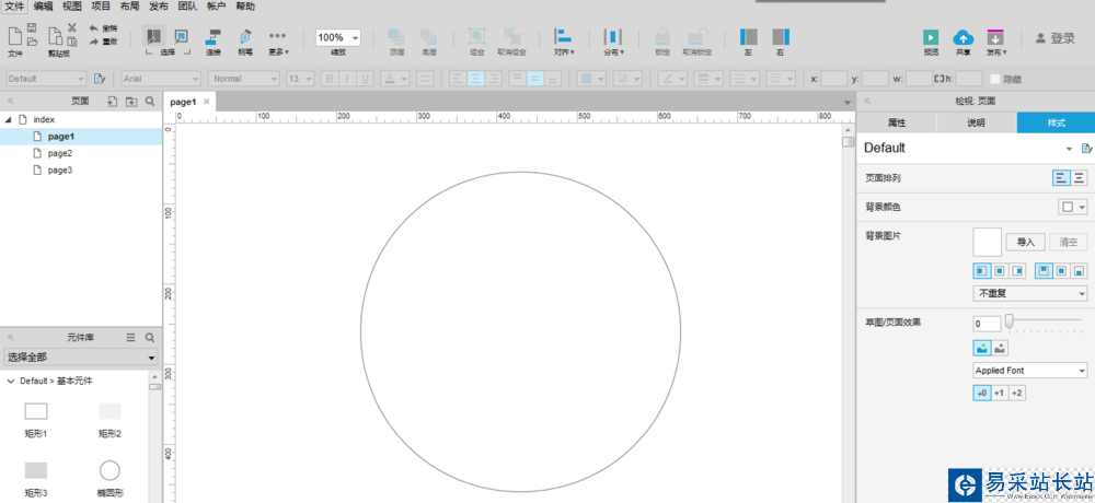 1、打開Axure RP 8設計原型軟件,在基本元件里拖曳一個圓形到畫布上,調整寬度和高度都為400,如下圖所示: