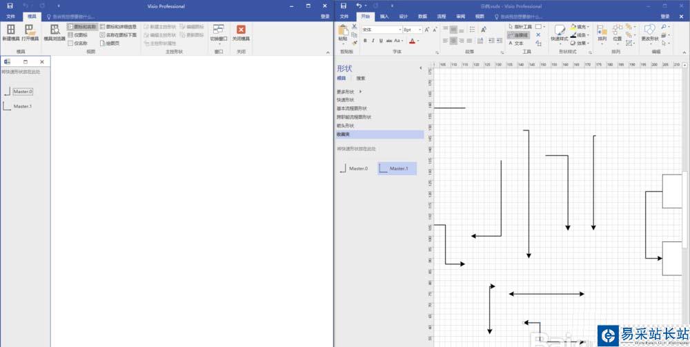 6、如果需要其他類型的連接線,可重復(fù)上述步驟,添加新的形狀。注意編輯“收藏夾.vssx”文件時(shí)要關(guān)閉Visio2016中頁(yè)面左側(cè)“形狀-模具-更多形狀-我的形狀”中打開的收藏夾。如圖所示,Master.1是新添加的首末兩端均帶有05型箭頭的新形狀,以此匯出的連接線均為此類型,不必再挨個(gè)連接線修改其形狀。(圖中左側(cè)窗口仍為編輯好的收藏夾文件,右側(cè)窗口是之后打開收藏夾的流程圖繪制文件,可自由在兩種箭頭類型連接線間切換)