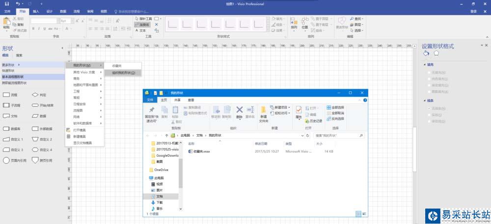 3、在頁(yè)面左側(cè),選擇“形狀-模具-更多形狀-我的形狀-組織我的形狀”,彈出一個(gè)文件窗口,打開里面的“收藏夾.vssx”文件。
