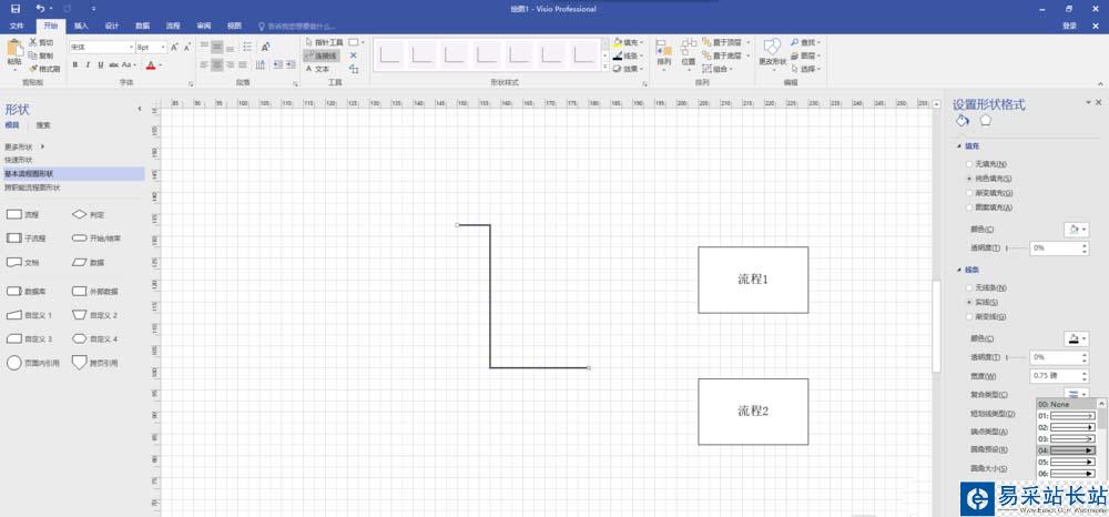 1、打開Visio2016,新建一個(gè)基本流程圖形狀的文件,進(jìn)入編輯界面。選擇開始-工具-連接線工具,在頁(yè)面中任意畫一條連接線。這是Visio2016默認(rèn)的連接線,不帶箭頭。