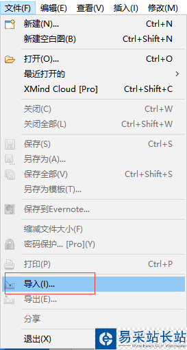 2、打開XMind軟件,選擇“文件”菜單下的“導入”選項。注意:是導入不是打開,很多人選擇直接打開,是找不到對應文件的。