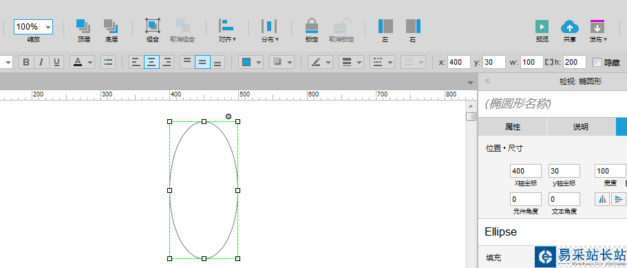 2、將橢圓形的高度和寬度改為200*100,讓其看起來像一只氣球,如下圖所示: