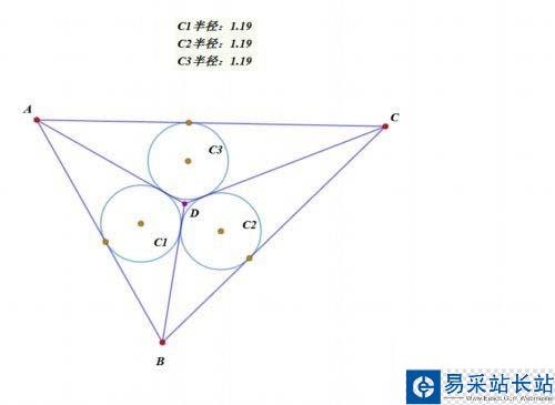 網(wǎng)絡(luò)畫板畫板又有新能力了,下面,我就用這一點(diǎn),來處理等內(nèi)切圓問題:在△ABC所在平面上找到點(diǎn)D,使得△ABD、△BCD、△CAD的內(nèi)切圓半徑相等。事先說明,我用的方法不屬于“尺規(guī)作圖”,而是交軌法。