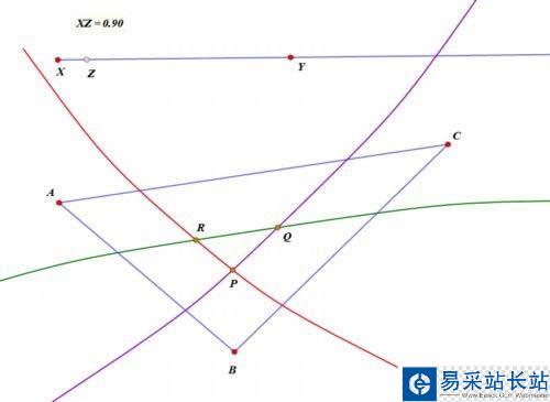 8、先后選擇Z、P,構(gòu)造軌跡(可能有點(diǎn)卡,把樣本數(shù)改為50就會(huì)好一點(diǎn),圖中的綠色粗線);先后選擇Z、Q,構(gòu)造軌跡(可能有點(diǎn)卡,把樣本數(shù)改為50就會(huì)好一點(diǎn),圖中的紅色粗線);P和Q的軌跡線的交點(diǎn),就是要作的D點(diǎn)。這里,可以肯定的是,R的軌跡也過D,所以,為了防止畫板變得更卡,就不畫R的軌跡線了。