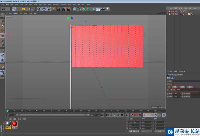 6、接下來就是要將在、旗幟綁定在旗幟上,以免旗幟飄跑,給平面添加布料綁帶,然后將平面調整到點模式,然后選擇和旗桿比較近的點,然后將圓柱拖到布料綁帶的綁定里,然后點擊設置,這樣就可以將你選擇的那個點綁定到旗桿上了。接下來可以重復的步驟,多綁定幾個點。