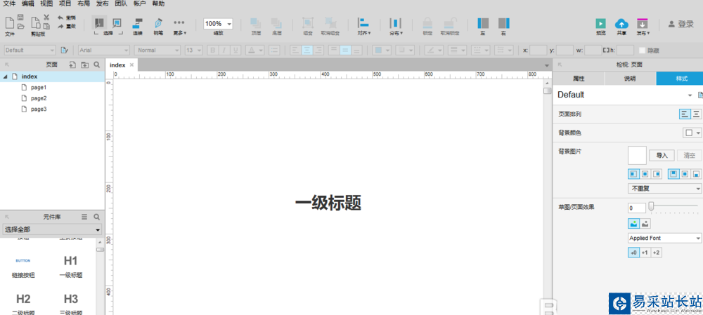 1、雙擊打開Axure RP 8設計軟件,在基本元件中找到H1標題,如下圖所示: