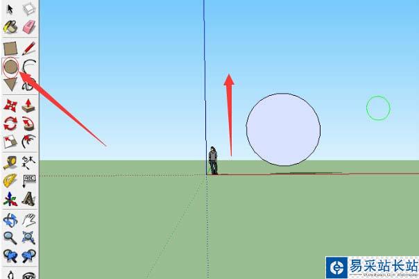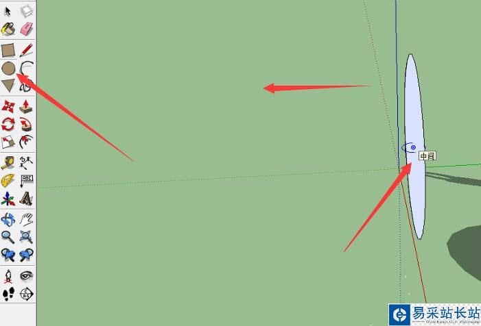 4、選取畫圓工具,以之前畫的圓的中心為中心,在水平面上畫圓,通過控制邊,使畫的圓跟之前的圓一樣大小。