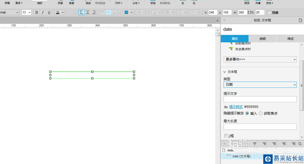 Axure RP 8設計軟件中的基本表單元件------輸入框,除了可以輸入文本內容,還可以輸入密碼、電子郵件、日期、電話等。下面利用一個實例說明輸入框可以輸入顯示日期,具體操作如下: