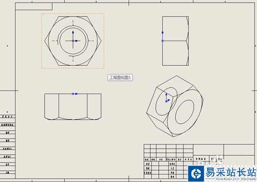 3、將螺栓三維模型按主視圖、俯視圖、左視圖和三維示意圖的順序依次放置在圖紙中,如下圖