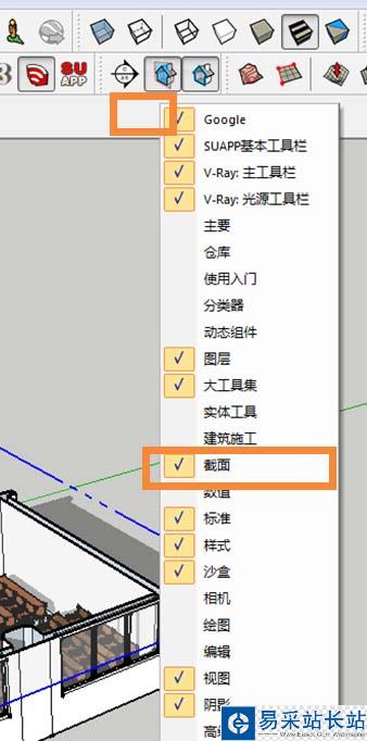 4、用su里自帶的剖切工具進行切割(如果沒找到剖切工具的,在上方工具欄里灰色空白處右鍵,選擇截面,就會出現(xiàn)剖切工具)