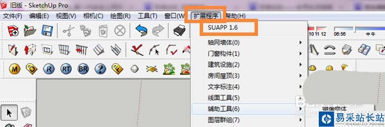 2、安裝好后,工具欄里就會出現(xiàn)“擴展程序”,點開就是SUAPP了