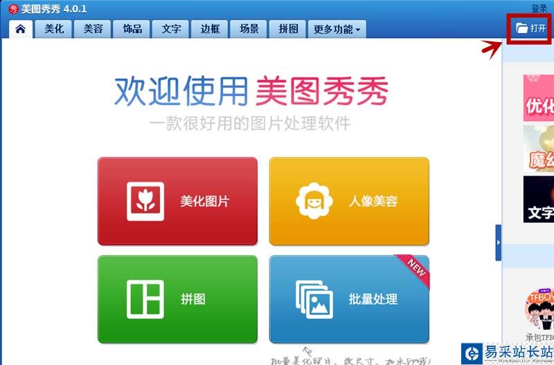 2、在美圖秀秀軟件中,單擊打開圖標打開。