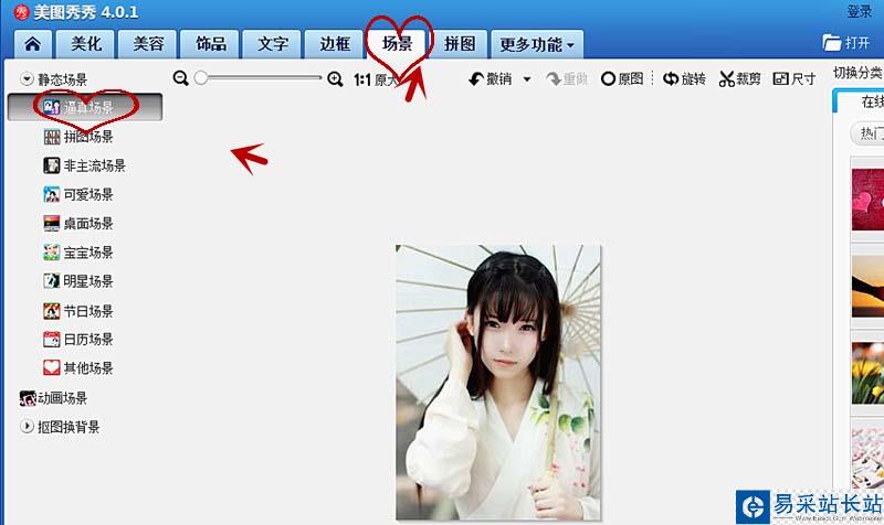 4、在美圖秀秀軟件中單擊場景。再單擊逼真場景。