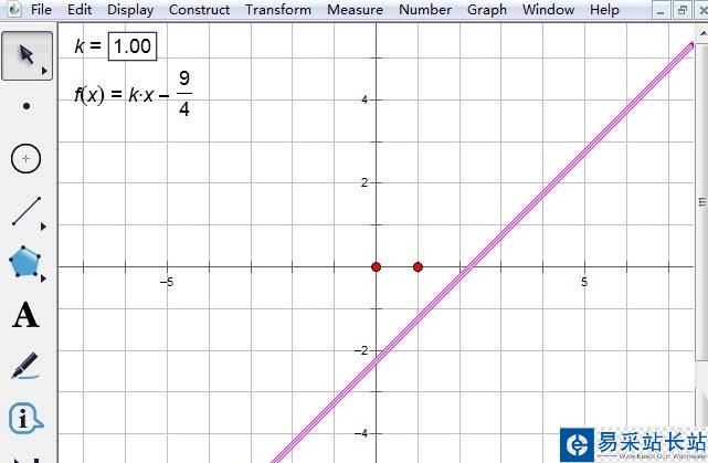 對于系數確定的一次函數,可以通過列表、描點、連線的方法畫出其具體的函數圖像,那么如果是系數不確定的一次函數,該怎么表現出其函數圖像呢?作為輔助數學學習的工具,幾何畫板不僅可以用來畫解析式確定的函數圖像,對于那些系數為參數的函數圖像也是可以構造的,就比如用幾何畫板畫出y=kx-9/4的圖像,通過改變系數k的值,就可以觀看不同的一次函數圖像。