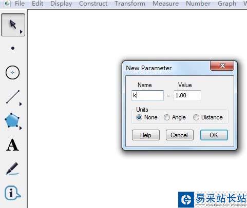 1、新建參數k。打開幾何畫板,單擊上方菜單欄“數據”菜單,在其下拉選項選擇“新建參數”,這樣就會打開新建參數對話框,輸入名稱“k”,單位選擇無,然后單擊確定,這樣就新建好了參數k。
