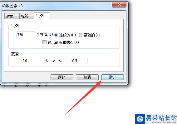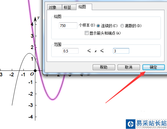4、這樣畫出來是一條完整的拋物線,如何限制它的范圍呢?選中拋物線,右擊選擇屬性,繪圖,把顯示箭頭的勾去掉。輸入取值范圍,確定。這樣就畫好了一段圖象。