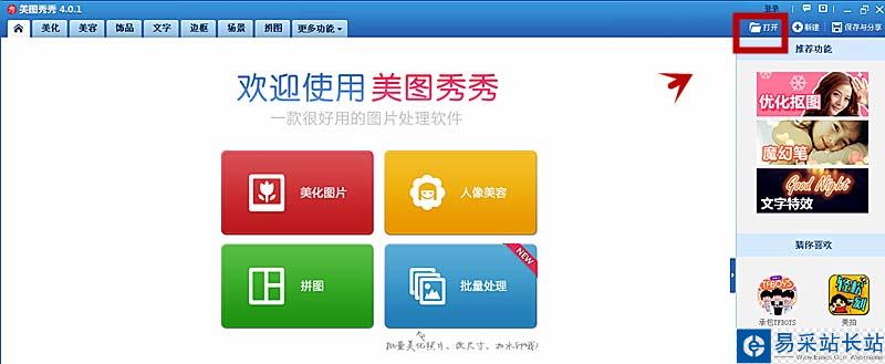 2、在美圖秀秀軟件中,單擊打開圖標(biāo)打開。