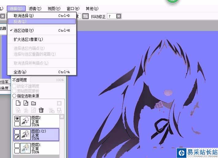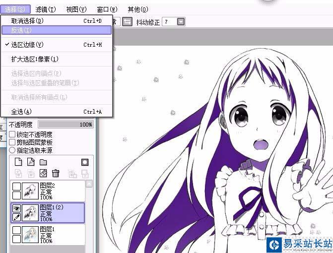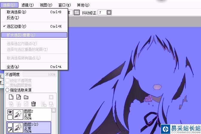 6、按住ctrl用鼠標左鍵單擊深色圖層選中,再回到黑白圖層,點擊:選擇—>反選,選中了深色圖層以外的部分,再點擊:選擇—>擴大選區1像素(如果線條較粗的話需要重復幾次擴大選區1像素的操作,這里線條比較細,一共進行了兩次),最后再點一次:選擇—>反選